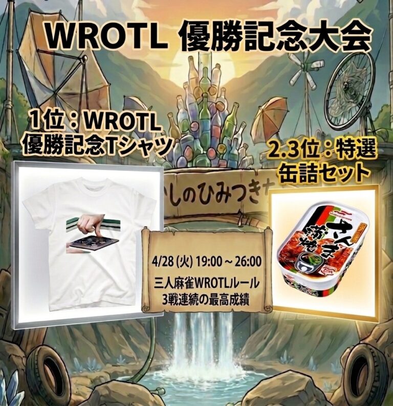 ■ 大会概要 【大会名】 WORLD RIICHI Online Team League 2026 三人麻雀 優勝記念大会! 【期間】 2026年4月28日(火)19:00~26:00 【ルール】 三人麻雀WROTLルール(赤あり)連続3戦の最大合計 […]